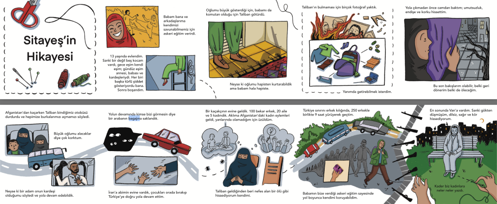 hafızalaştırma çalışması gerçekleştirdim. Özellikle üzerine açıkça konuşulmayan, yaşanan hak ihlallerinin görünmez kılındığı göç meselesinde, bir kadının göç yolculuğunu, Sitayeş’in hikayesini, çizimler aracılığıyla görünür hale getirdik. Hafıza çalışmalarının adalet arayışında önemli bir rolü olduğuna inanıyorum. Çünkü Türkiye’de yargı mekanizmalarının çoğu zaman işlememesi nedeniyle adalet arayışı yıllar sürebilir ya da hiç sonuçlanmayabilir. Bu noktada devreye giren hafızalaştırma çalışmaları, hak ihlallerini belgelemek ve unutmamak için birer araç. Çünkü hafızayı diri tutmak, hatırlamak, mücadeleleri yönetiyor. Hatırladıkça mücadele etme motivasyumuz artıyor, hatırladıkça adalet talebimiz yükseliyor. Hatırladıkça paylaşıyoruz aslında ve birlikte hatırlamak kolektif hafızayı da kuvvetlendiriyor.